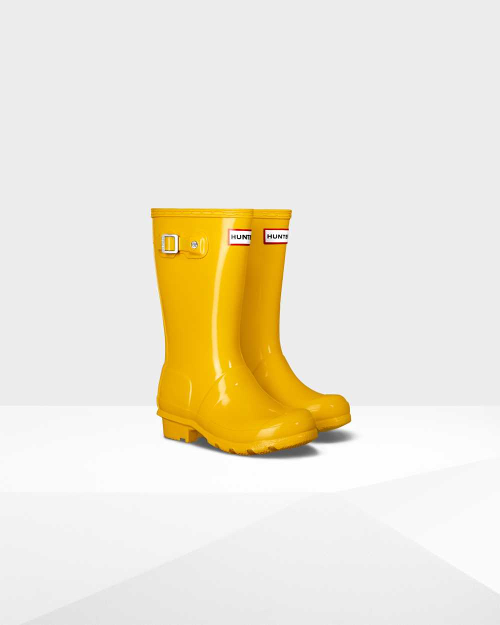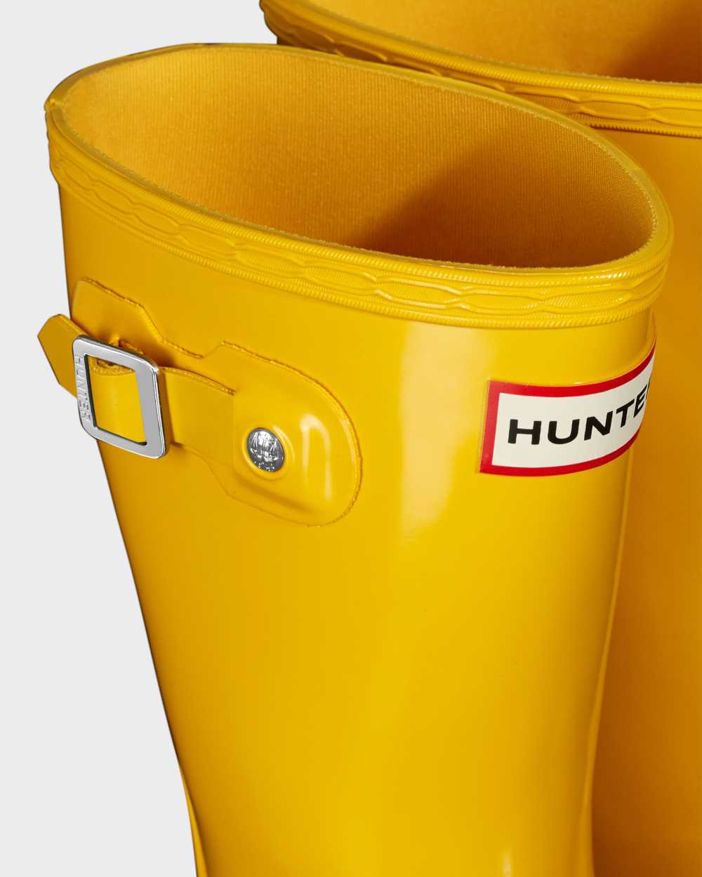 A mini version of the iconic Original Tall Boot, the Original Kids Gloss Rain Boot is a dream for junior explorers. This sunshine yellow waterproof boot is handcrafted from natural rubber with a gloss finish. Designed for adventures, our specialised kids boots are highly resistant to wear and abrasion with a polyester lining for comfort. Reflective patches and the Hunter Original tread offer added safety so you can be confident letting them take on the elements whatever the weather.