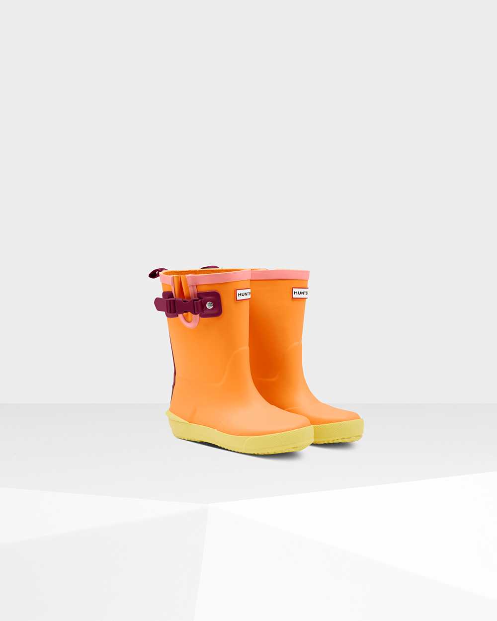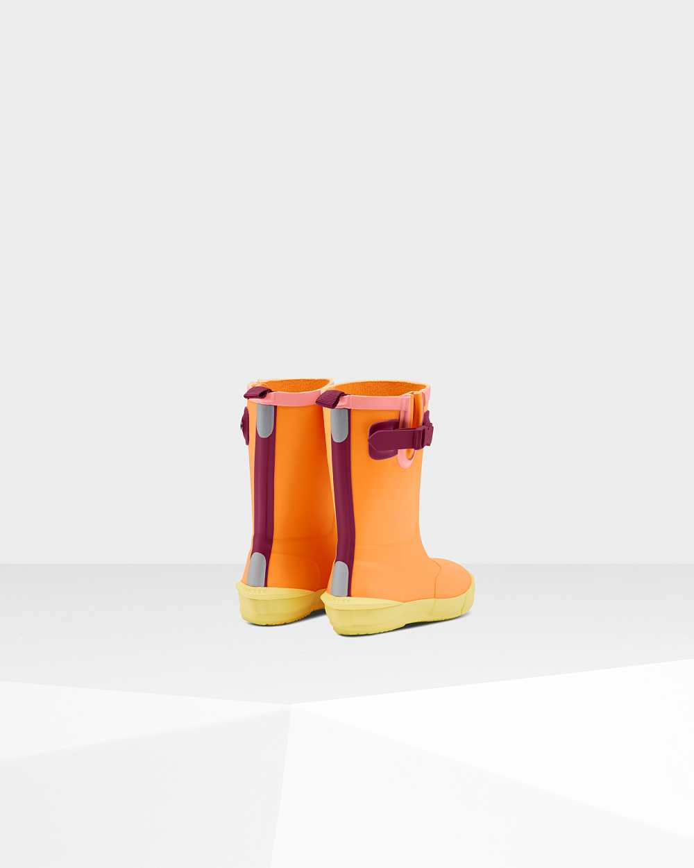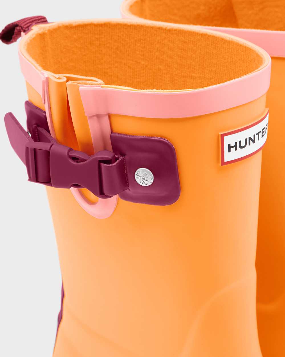 Take the fun of the wild wherever you go with this bright orange Kids Rain Boot. With colorful and fun contrasting details, your little one won't want to take this vibrant boot off. Perfect for puddle splashing, each boot is handcrafted from natural rubber. A flat sole and rounded toe gives little feet room to move and with the added safety of reflective patches and the Hunter Original tread, so you can let your little explorers take on the elements whatever the weather.