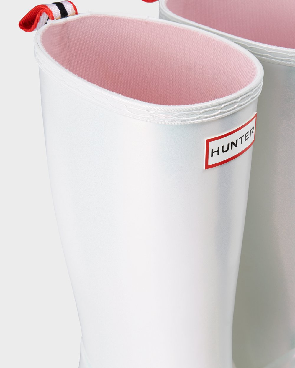 Inspired by moonlight hitting glistening Scottish Coastal waters and glassy rockpool surfaces, the Nebula Play Boot is one of its kind. Simplifying the iconic design of the Original Tall Boot, the Play Boot offers a dynamic silhouette with a flatter platform sole for maximum comfort and versatility. Crafted from the highest quality natural rubber, this women's wellington is 100% waterproof. At a stylish mid-calf height, this tall white boot is a stylish height that complements street style, festival flair and everything in between, so you can play it your way. Fashioned with a two-tone iridescent finish that shimmers in the light, it blends playfulness and practicality.