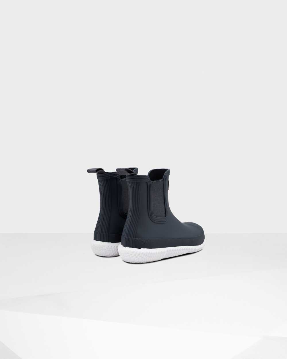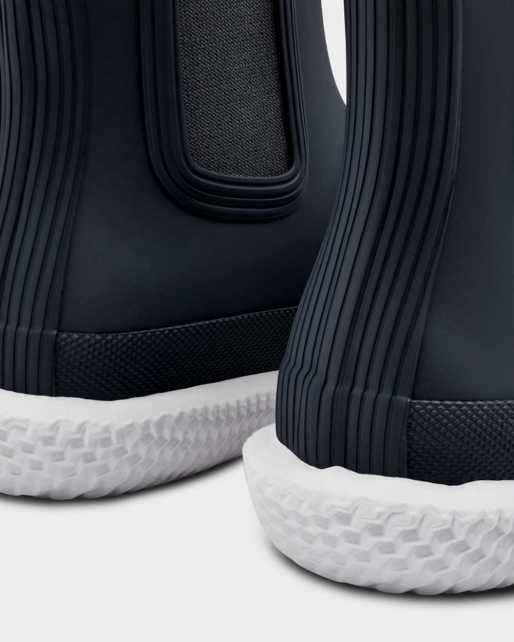 Hunter's iconic waterproof Chelsea boot is updated with a zig-zag technical calendar sole, which provides exceptional grip on rough surfaces. Completely handcrafted, these boots are finished with panels of texture and a wraparound footbed, as well as features instantly recognisable to a Chelsea silhouette, such as elasticated gussets. These navy and white boots are fully lined for comfort and include pull tabs for ease of foot entry.