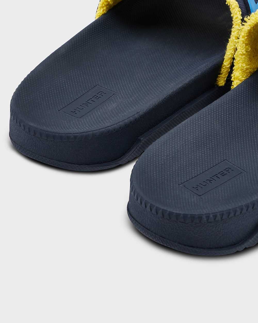 Hunter's Original Adjustable slides are updated with the new navy Rock Pool Camo print, which is inspired by the busy microscopic life, rubbery seaweed and colorful sea creatures found in Scottish coastal rock pools. Engineered with a neoprene upper, which is lined with moisture-absorbing terry towelling, these slides are fastened with a velcro strap for a customisable fit. Easy to clean and quick to dry, these lightweight womens sliders combine the softness of a beach towel with the comfort of a moulded footbed.