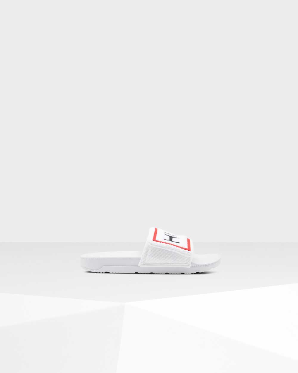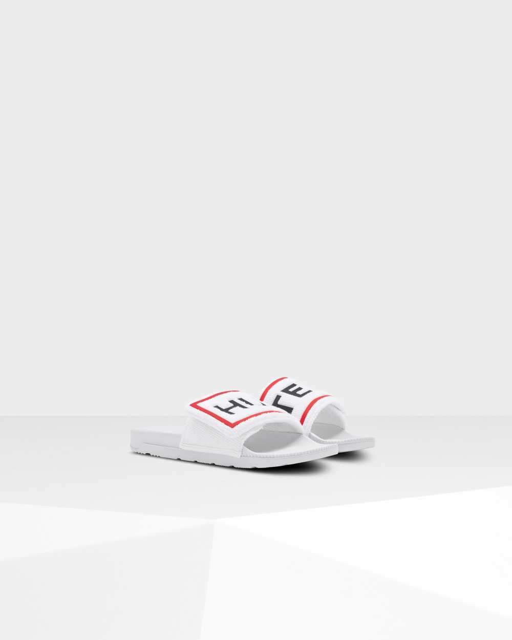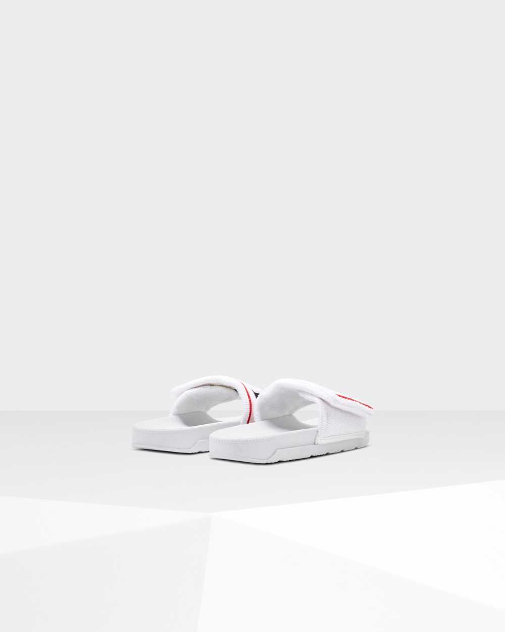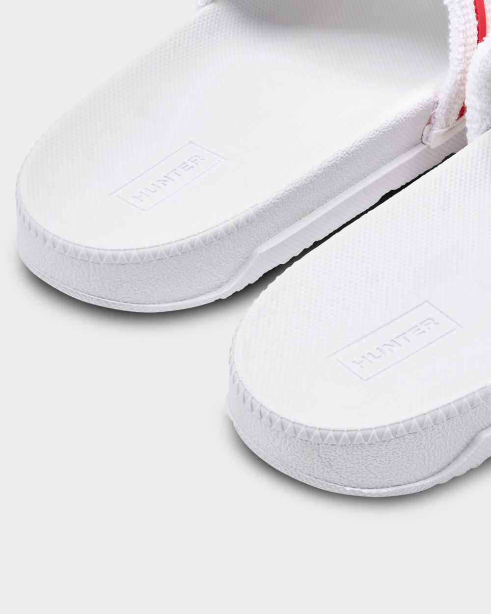 The lightweight, Original Adjustable slides combine the softness or a beach towel with the comfort of a moulded footbed. Crafted from moisture-absorbing terry towelling, which eliminates irritation with every step, these white womens slides are fastened with a velcro strap stamped with the Hunter box logo for a customisable fit. Easy to clean and quick to dry, they are breathable, flexible and designed for long hot days by the pool.